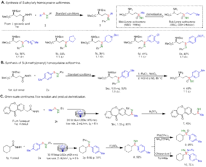 磺酸和磺酰胺广泛存在于多种天然产物、药物和功能材料中,但其合成依然受限于预制备的有机硫化物、底物的亲核性和官能团的兼容性。针对以上问题,开展可见光介导含硫小分子高效合成工作:以脂肪胺基磺酰氯为自由基源,通过调节光催化剂,在室温和蓝光催化条件下,实现缺电子烯烃精准可控的磺酸化和磺酰胺化环化反应;以胺基磺酰氯为自由基源,实现多种烯烃的胺基磺酰化反应;通过光氧化还原和铜协同催化,在室温条件下,实现从芳基自由基前体(芳基硫鎓盐、芳基重氮盐和芳基碘鎓)到芳基磺酰胺的一步法高效合成。为含硫药物及天然产物的高效合成提供简洁的工艺路线。