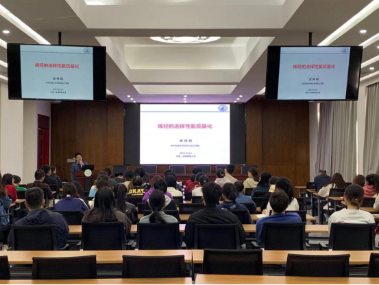讲座一开始袁伟明研究员向同学们简明扼要的介绍了研究背景,烷基胺骨架普遍存在于天然产物和药物分子中,发展高效构建烷基胺的合成方法学具有重要意义。现如今,烯烃的氨烷基化是构建烷基胺的高效手段之一,同时也是实现烯烃增值化的有效途径。传统涉及两电子过程的烯烃的氢氨烷基化存在反应条件苛刻、官能团兼容性差、需要贵金属催化剂、或预安装导向基团等问题。而基于单电子转移策略的烯烃氢氨烷基化反应具有条件温和、官能团兼容性好等优点,但是受到自由基极性匹配影响,亲核性的氨烷基自由基只能与缺电子烯烃反应,且只能获得反马氏选择性。此外,袁伟明老师向同学讲述了课题组目前发展的镍/可见光协同催化策略实现了缺电子烯烃的马氏选择性氢氨烷基化,得到了一系列支链烷基胺,并利用NiH链行走机制实现了非活化烯烃的迁移氢氨烷基化的实验方案。以及目前课题组正在研究的配体调控烯烃的区域选择性芳基/氨烷基化和烷基/氨烷基化反应,为构建高附加值的β和γ-氨基酸衍生物提供了高效合成手段。