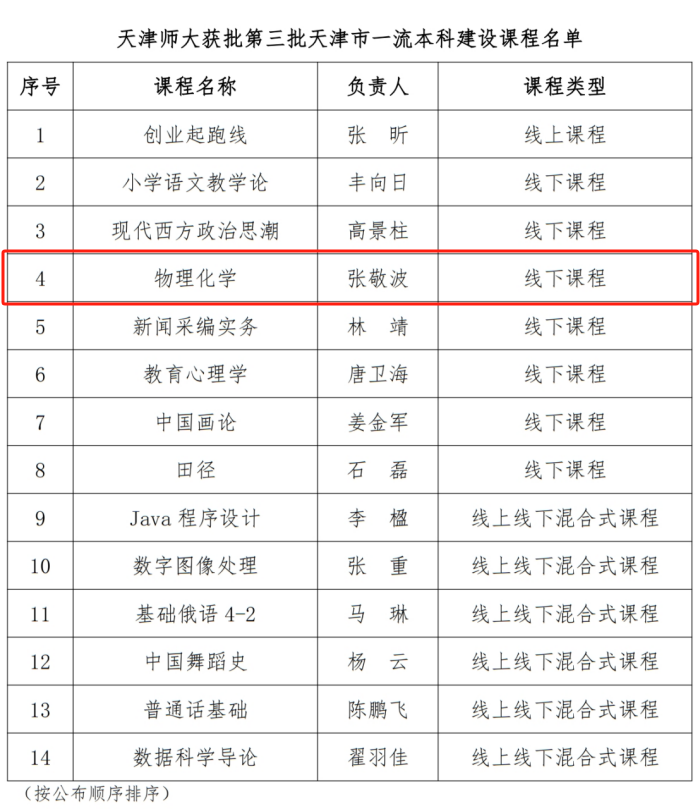近日,天津市教委公布了第三批天津市一流本科建设课程名单,公司“物理化学”被认定为第三批天津市一流本科建设课程。