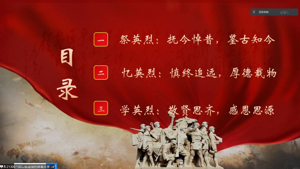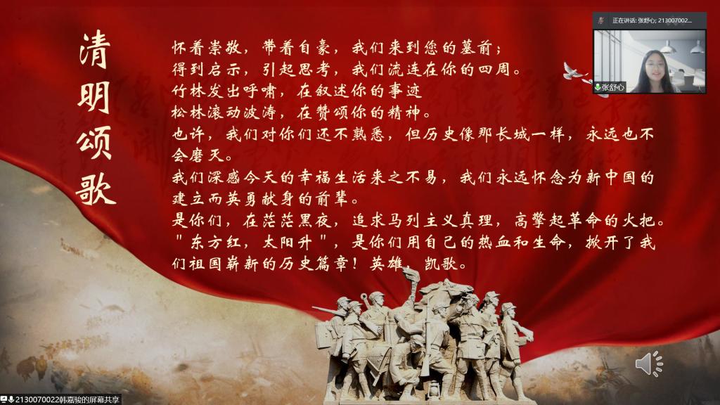 活动分为“祭英烈”“忆英烈”“学英烈”三个环节。“祭英烈:抚今悼昔,鉴古知今”环节中,2101班王博洋同学和2103班张舒心同学深情朗诵《清明颂歌》,共寄哀思;2102班冯金旭同学带来题为《缅怀革命先烈,传承红色基因》的深情演讲,带领大家重温激情燃烧的红色岁月,向老一辈革命家致敬。